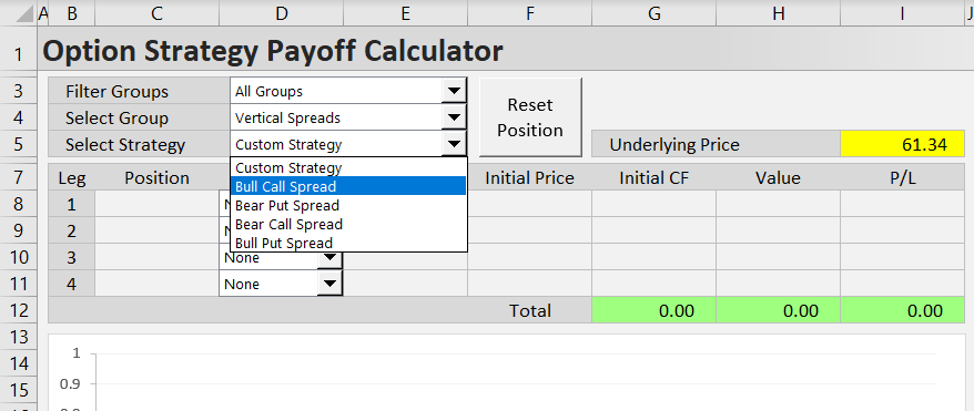 The easiest way to start is by selecting an option strategy from the dropdown box in cell E5.